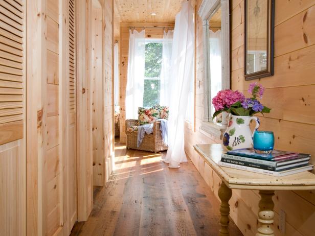 Master Bedroom Entry Pine Shiplap Walls - This long hallway is a warm welcome to the master bedroom ahead and features three closets for extra storage. The louvered pine doors add the the charm of the pine shiplap walls and reclaimed hemlock wood floors that give it that genuine cottage feel.